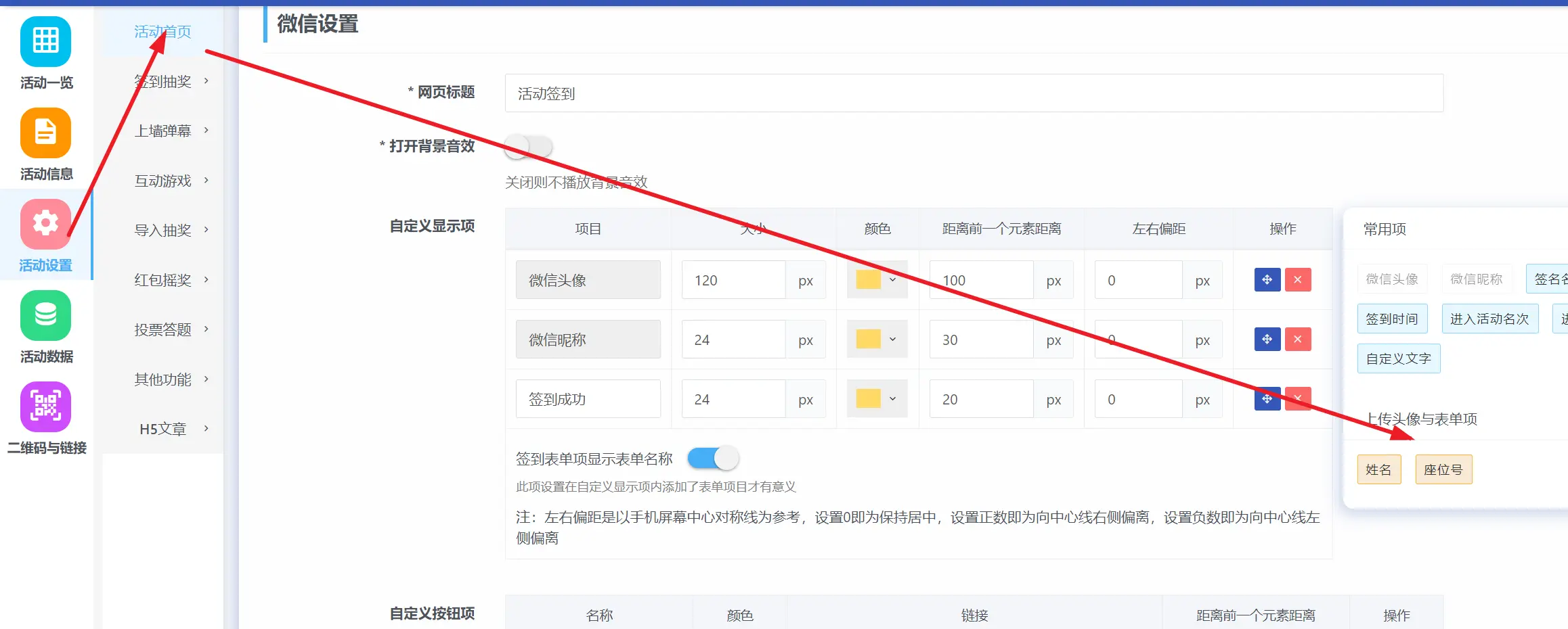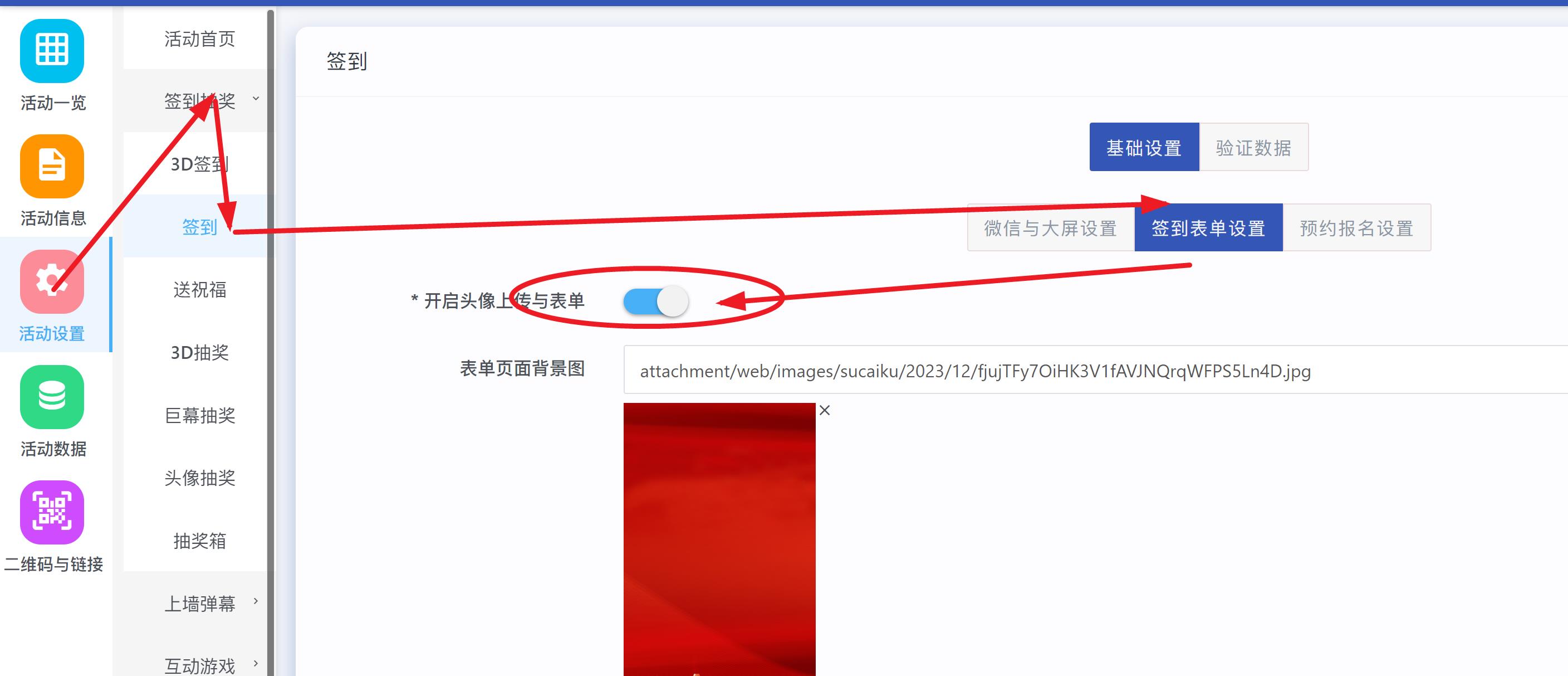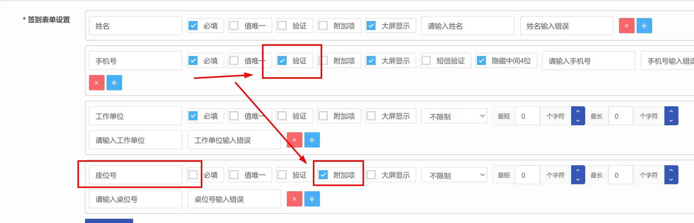 目录 搜索 展开 基础设置功能说明大屏使用注意事项后台首页登录后设置绑定公众号切换游览器端使用二维码获取红包雨功能赠送10秒倒数视频素材mp4签到抽奖设置(扫码)扫码抽奖设置任意抽奖不重复设置多奖品随机抽奖设置签到验证和座位号签到表单和中奖查询中奖通知设置预约报名+签到现场核验地图签到分组设置中奖记录管理现场核销导入抽奖设置(单机)导入抽奖设置(单机)导入抽奖分组设置照片抽奖设置表格隐藏字段多奖品同时抽奖设置第三方直播使用导入名单抽奖教程2游戏设置游戏奖品设置投票和评分设置投票评分答题设置后台创建答题酒吧上墙霸屏功能独立版导入抽奖功能教程独立版导入名单数字系统使用教程 暂无相关搜索结果! 阅读次数:201 本文档使用 MinDoc 发布 签到验证和座位号 如何实现扫码输入姓名手机或者工号这些匹配后 显示座位号?先按表单教程 去签到里面 开启表单功能; 然后按下面图,把要验证的项目勾选上验证,座位号勾选附加项; 设置后我们去验证数据里面添加验证的项目内容; 再去活动首页设置显示座位号项目即可;最后我们手机扫码后填写验证项手机比如199999999666 就能通过了,如图效果。作者:哲蓝科技 创建时间:2024-10-18 22:37最后编辑:哲蓝科技 更新时间:2025-11-07 15:49