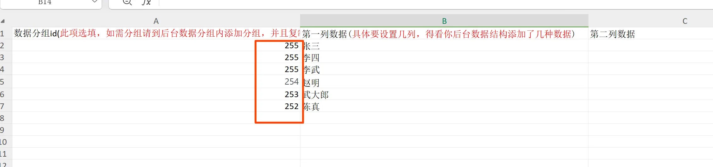 点本地数据,导入表格,打开表格 A列就是填写这些对应ID的数据,比如张三是研发部这里填上面的创建id是255的数字上去。