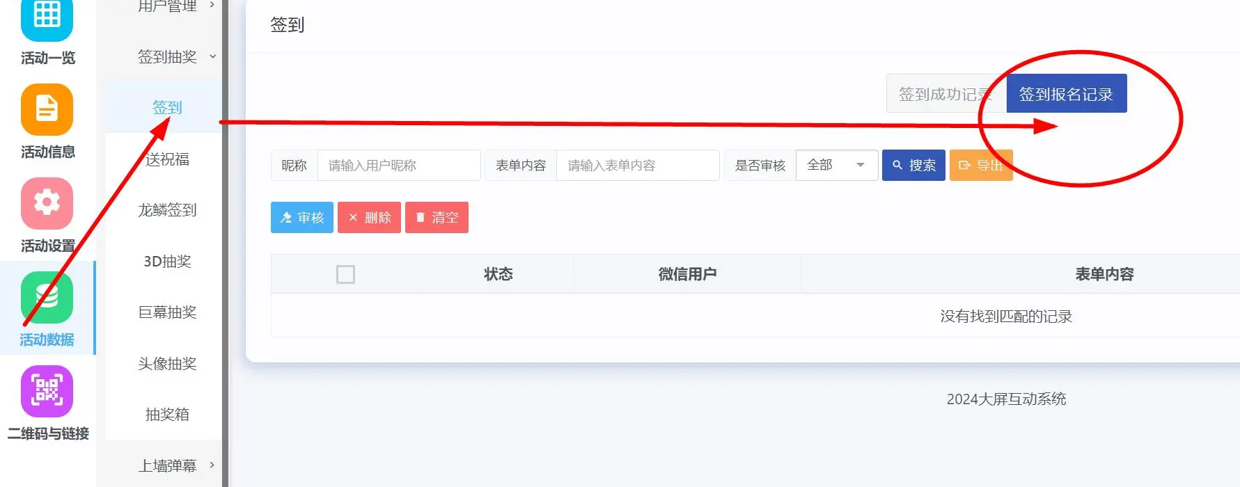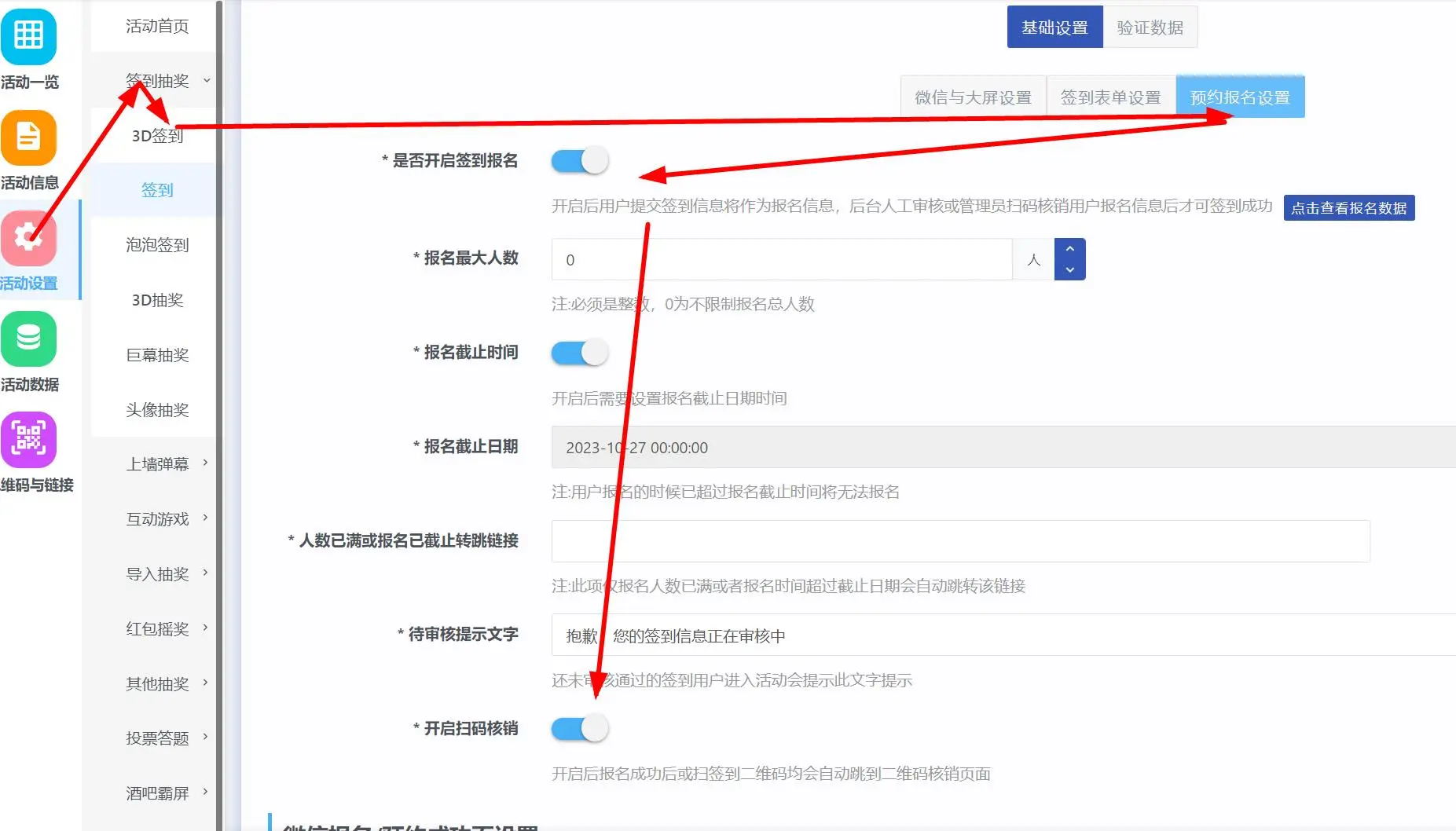 目录 搜索 展开 基础设置功能说明大屏使用注意事项后台首页登录后设置绑定公众号切换游览器端使用二维码获取红包雨功能赠送10秒倒数视频素材mp4签到抽奖设置(扫码)扫码抽奖设置任意抽奖不重复设置多奖品随机抽奖设置签到验证和座位号签到表单和中奖查询中奖通知设置预约报名+签到现场核验地图签到分组设置中奖记录管理现场核销导入抽奖设置(单机)导入抽奖设置(单机)导入抽奖分组设置照片抽奖设置表格隐藏字段多奖品同时抽奖设置第三方直播使用导入名单抽奖教程2游戏设置游戏奖品设置投票和评分设置投票评分答题设置后台创建答题酒吧上墙霸屏功能独立版导入抽奖功能教程独立版导入名单数字系统使用教程 暂无相关搜索结果! 阅读次数:115 本文档使用 MinDoc 发布 预约报名+签到现场核验 使用场景:需要提前报名或者现场要审核通过才能进场的活动1、设置管理员:后台活动数据—全部用户-选择管理员设置好 2、开启签到表单和和预约报名 3、最后管理员微信右上角扫一扫用户的手机端报名签到核验码即可提示通过! 4、后台审核位置作者:哲蓝科技 创建时间:2024-10-18 22:40最后编辑:哲蓝科技 更新时间:2025-11-07 15:49