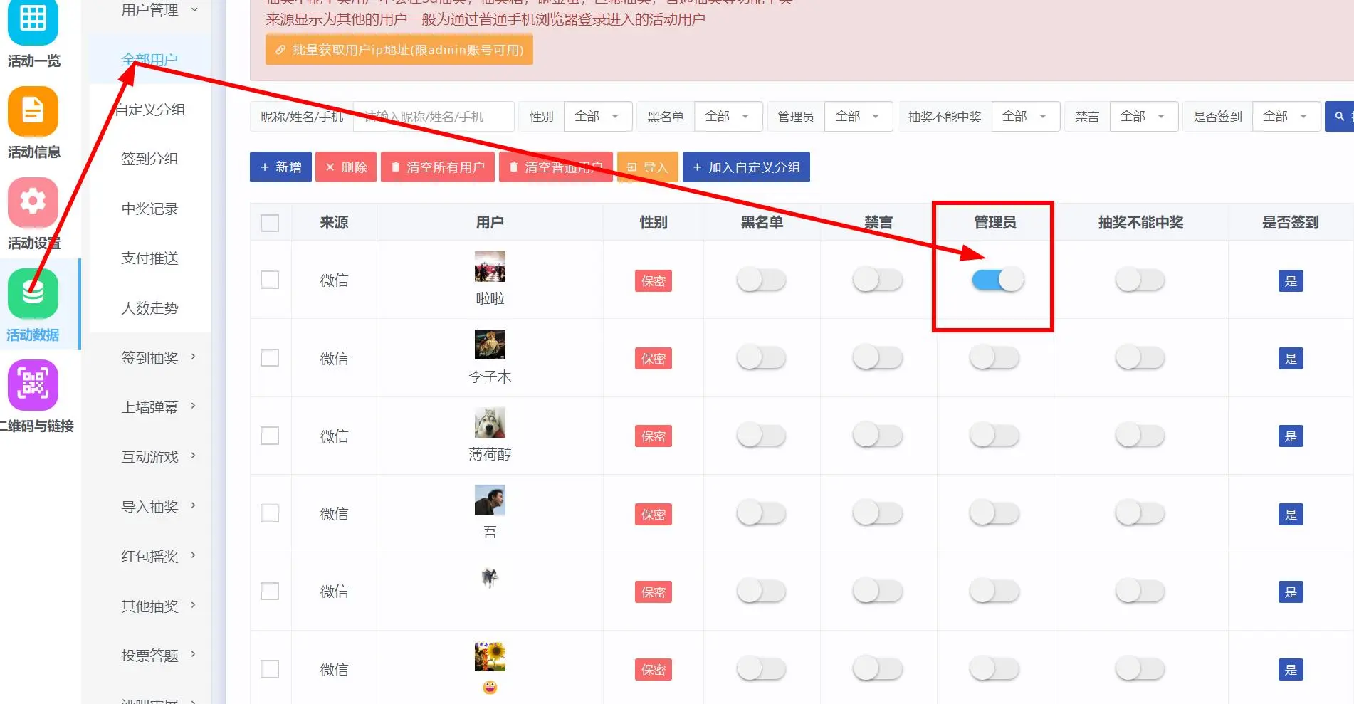 使用场景:需要提前报名或者现场要审核通过才能进场的活动1、设置管理员:后台活动数据—全部用户-选择管理员设置好 2、开启签到表单和和预约报名 3、最后管理员微信右上角扫一扫用户的手机端报名签到核验码即可提示通过! 4、后台审核位置作者:哲蓝科技 创建时间:2024-10-18 22:40最后编辑:哲蓝科技 更新时间:2025-11-07 15:49