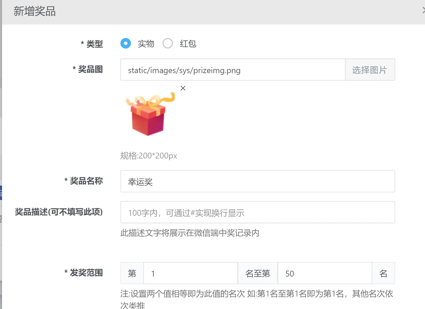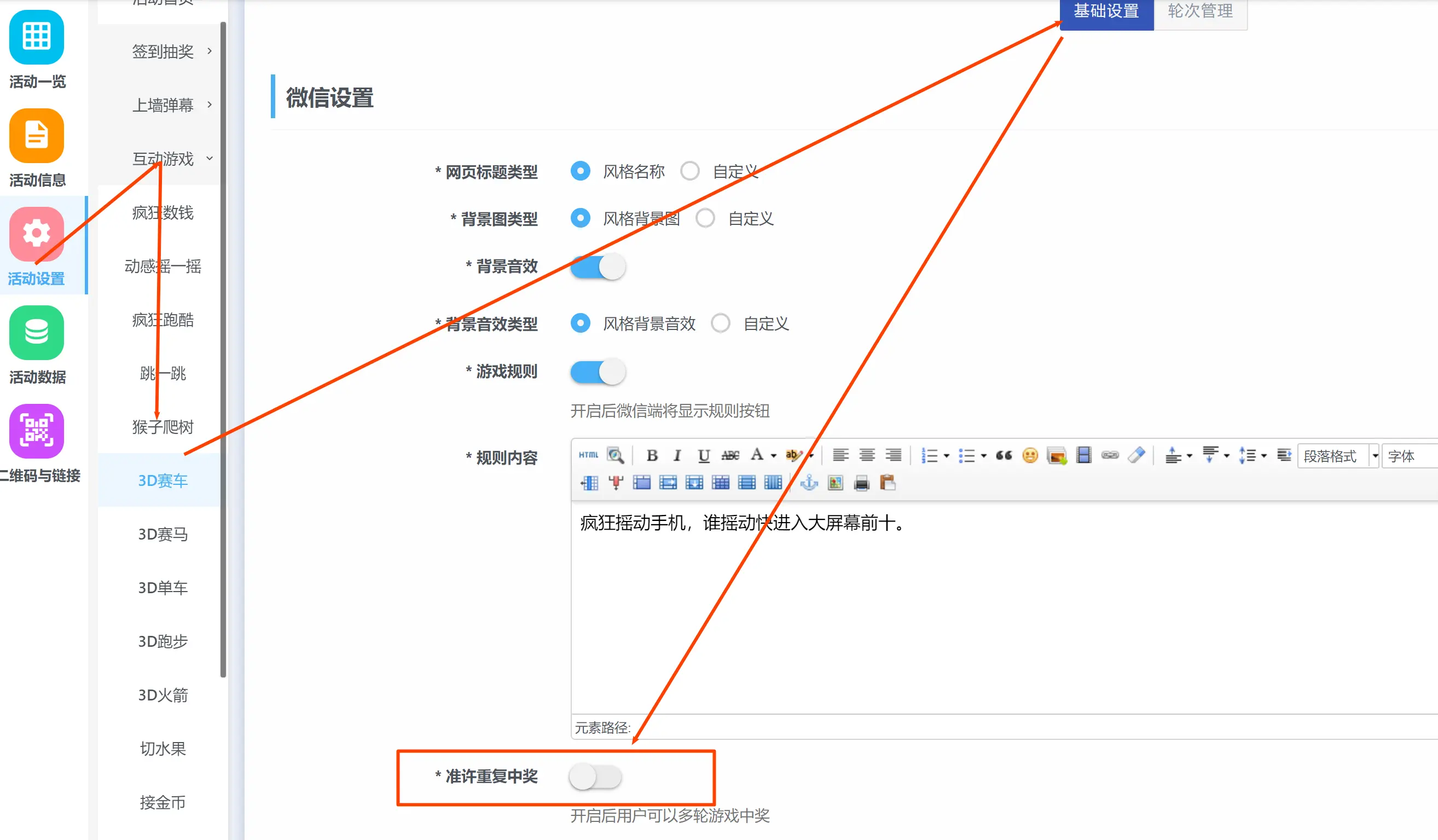 目录 搜索 展开 基础设置功能说明大屏使用注意事项后台首页登录后设置绑定公众号切换游览器端使用二维码获取红包雨功能赠送10秒倒数视频素材mp4签到抽奖设置(扫码)扫码抽奖设置任意抽奖不重复设置多奖品随机抽奖设置签到验证和座位号签到表单和中奖查询中奖通知设置预约报名+签到现场核验地图签到分组设置中奖记录管理现场核销导入抽奖设置(单机)导入抽奖设置(单机)导入抽奖分组设置照片抽奖设置表格隐藏字段多奖品同时抽奖设置第三方直播使用导入名单抽奖教程2游戏设置游戏奖品设置投票和评分设置投票评分答题设置后台创建答题酒吧上墙霸屏功能独立版导入抽奖功能教程独立版导入名单数字系统使用教程 暂无相关搜索结果! 阅读次数:137 本文档使用 MinDoc 发布 游戏奖品设置 默认所有游戏都是不显示奖品的,是结束后排名显示成绩如需要手机端中奖者显示奖品,按如下图示设置首先需要设置是否允许重复中奖,就是上一轮获奖的能不能参与下一轮 按图示设置 然后找到使用的游戏,以动感摇一摇为例,点轮次管理,箭头方向编辑每一轮里面的奖品 设置好后,大屏也只是显示成绩,但是中奖的 手机会有奖品提示如图 大屏轮次结束后 点排名 弹出列表显示作者:哲蓝科技 创建时间:2024-10-18 22:41最后编辑:哲蓝科技 更新时间:2025-11-07 15:49