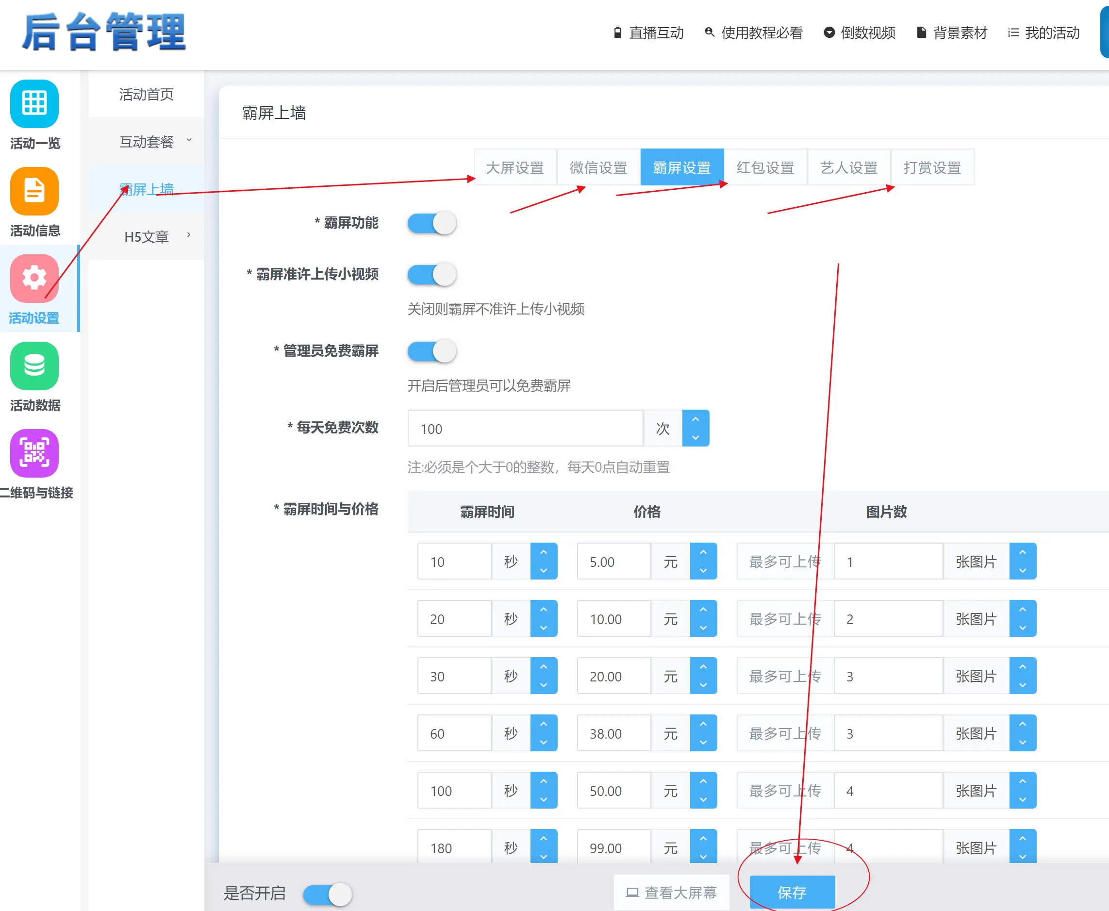 设置霸屏方法: 登录后台,功能设置,左侧活动设置找到霸屏上墙,默认已经配置好的了,自己要修改也可以改一下,注意*需要底部保存才可以。