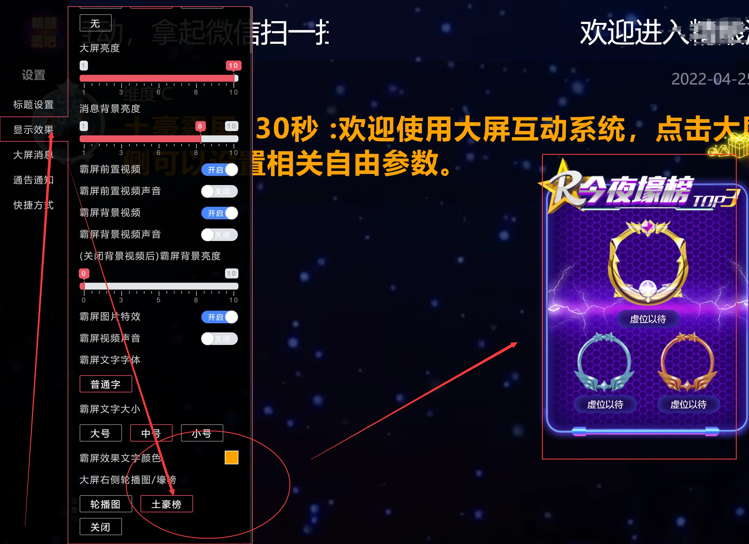 5,大屏提供了一些参数设置,比如字体大小,显示效果,背景,还有右侧轮换图片显示土豪榜方法:
