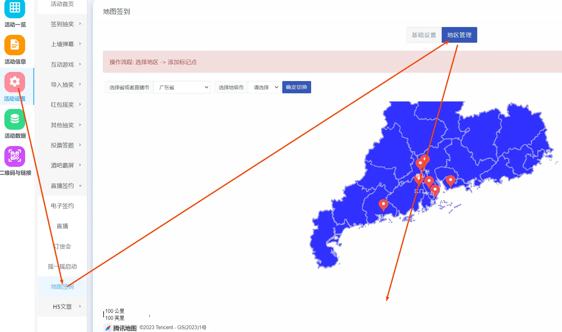 目录 搜索 展开 基础设置功能说明大屏使用注意事项后台首页登录后设置绑定公众号切换游览器端使用二维码获取红包雨功能赠送10秒倒数视频素材mp4签到抽奖设置(扫码)扫码抽奖设置任意抽奖不重复设置多奖品随机抽奖设置签到验证和座位号签到表单和中奖查询中奖通知设置预约报名+签到现场核验地图签到分组设置中奖记录管理现场核销导入抽奖设置(单机)导入抽奖设置(单机)导入抽奖分组设置照片抽奖设置表格隐藏字段多奖品同时抽奖设置第三方直播使用导入名单抽奖教程2游戏设置游戏奖品设置投票和评分设置投票评分答题设置后台创建答题酒吧上墙霸屏功能独立版导入抽奖功能教程独立版导入名单数字系统使用教程 暂无相关搜索结果! 阅读次数:80 本文档使用 MinDoc 发布 地图签到 先按图示去添加轮次注意下拉到底部才看到城市地区设置哦。作者:哲蓝科技 创建时间:2024-10-18 22:44最后编辑:哲蓝科技 更新时间:2025-11-07 15:49