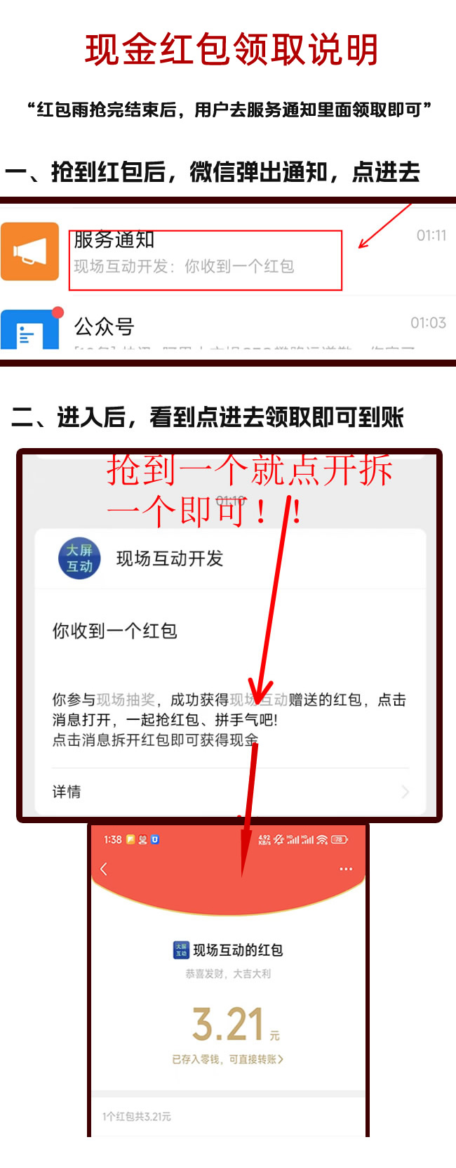 用户微信红包雨接完结束后,微信服务通知会发出一个通知,我们点进去领取即可。如下图