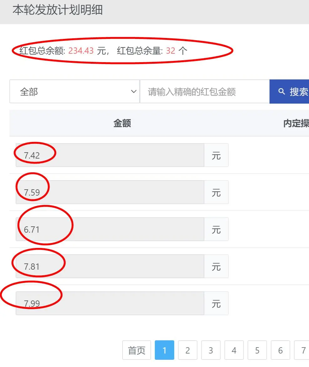 圈住的位置就是你这轮红包的发放,已经提前分配好了,自己看看分配的金额 和总价格还有个数,