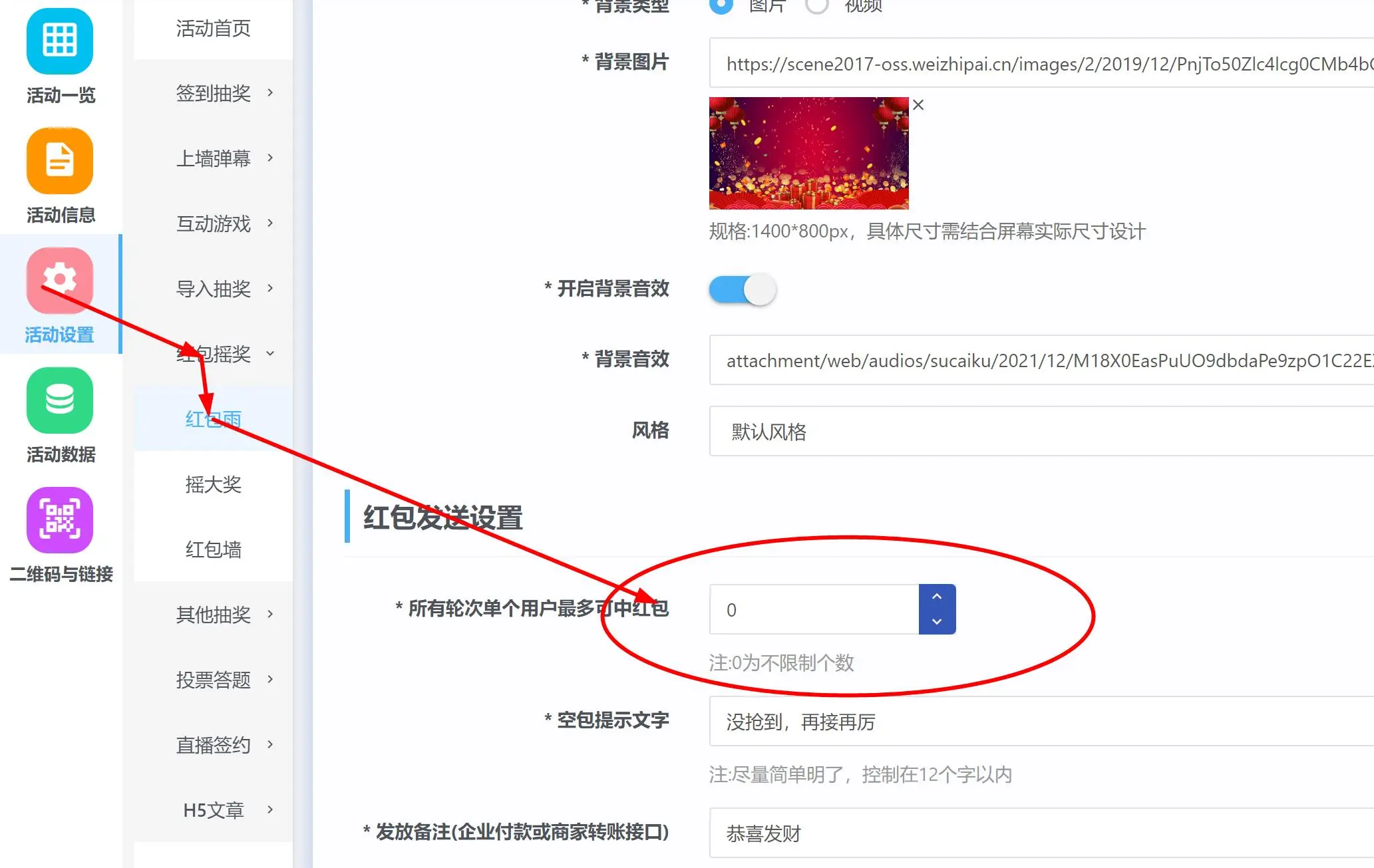 这里务必注意,这里如果填 1 代表的是你当天所有红包只能抢到一个,不管你发多少轮次,所以不要说为什么只抢到一个,这里可以改大!!!