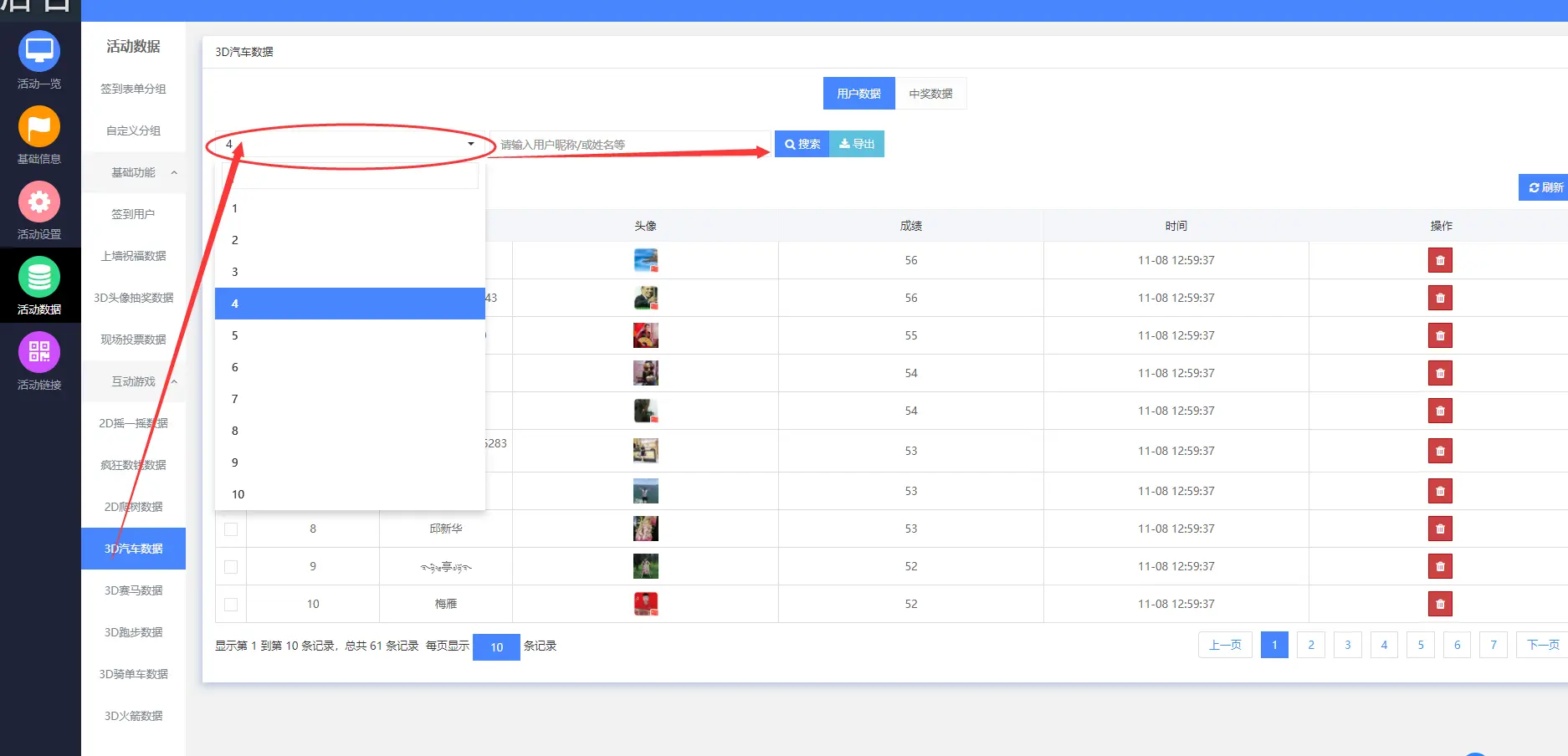 不管是3D抽奖和游戏,后台都可以查询到 ,找到功能设置,后左侧导航的 活动数据,注意图示里面的抽奖奖品和游戏轮次获奖信息,查询都要先这里红色框里面的,选择筛选出要看的奖品或者轮次,再点搜索才能查询!点图片可以放大看!作者:哲蓝科技 创建时间:2024-10-18 22:47最后编辑:哲蓝科技 更新时间:2025-11-07 15:49