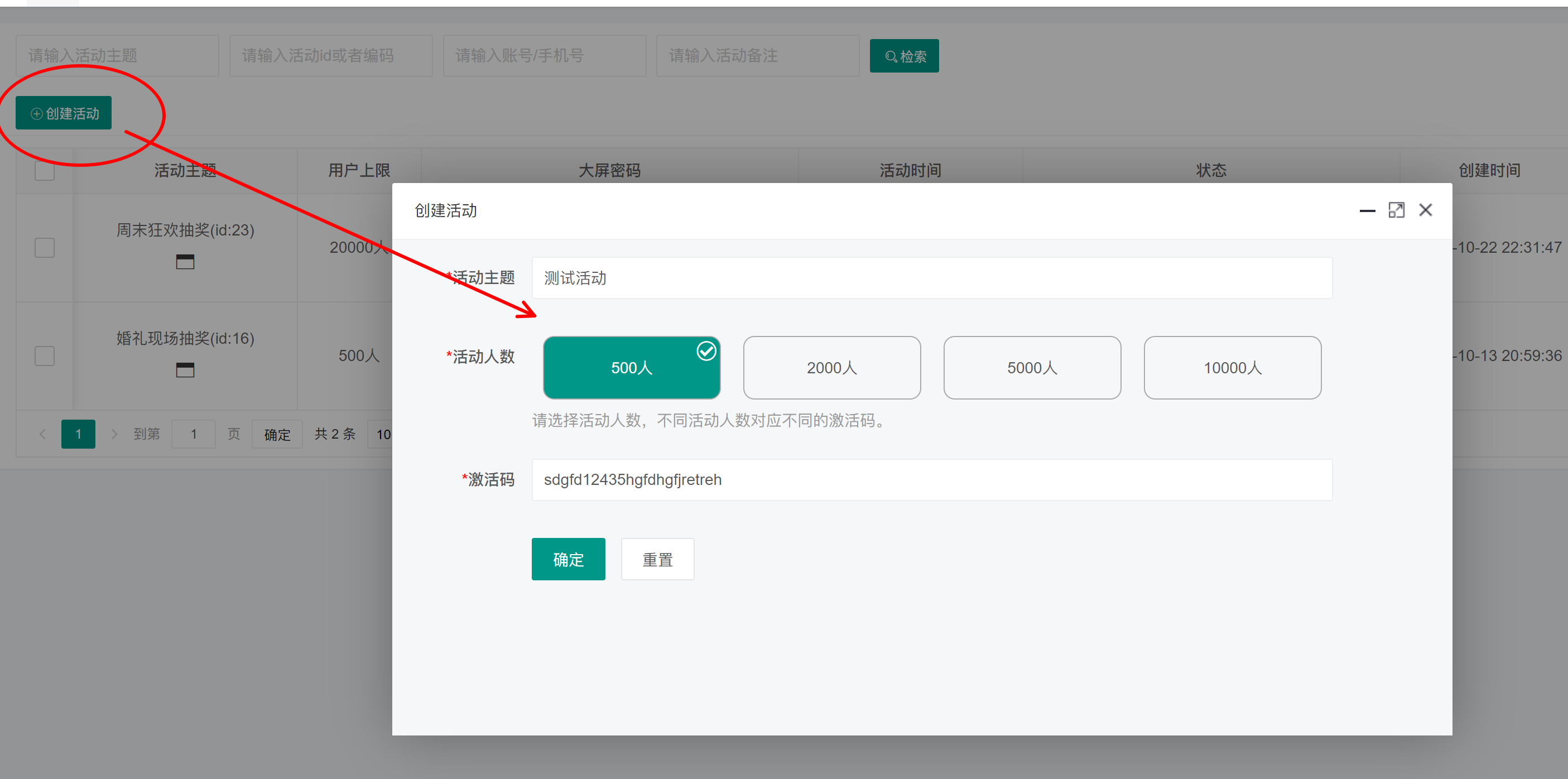 然后使用手机号登陆后台,点创建活动,输入购买后发给你的激活码(50元对应的是500人的套餐)