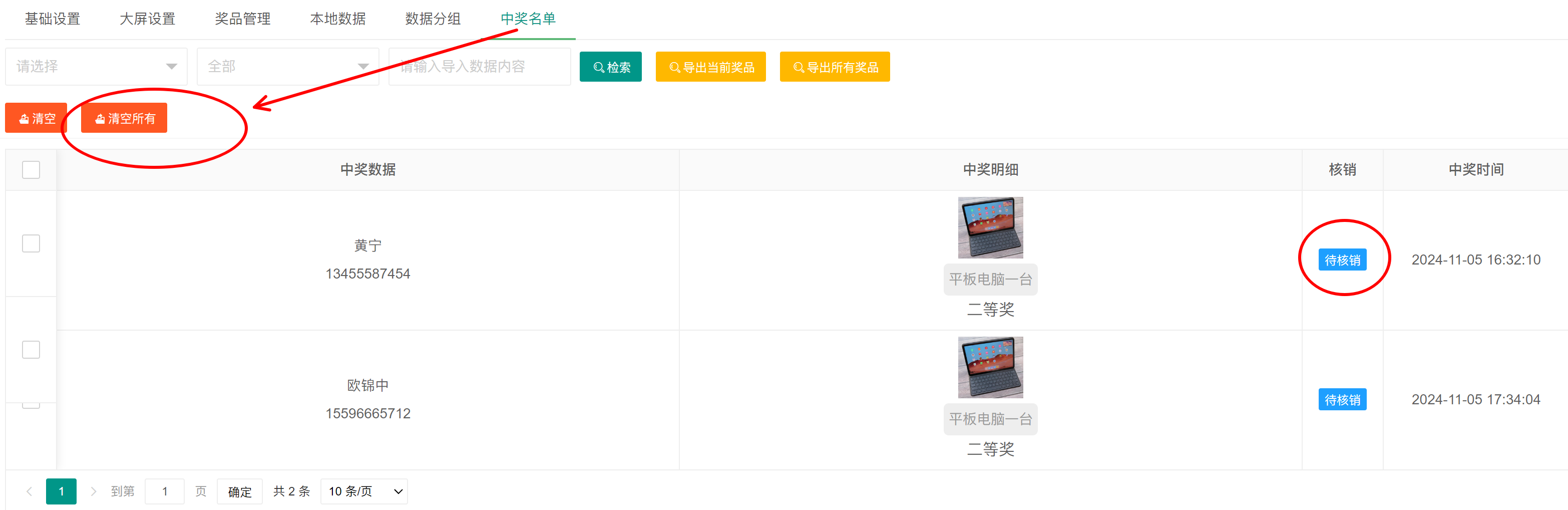 如现场已经兑奖了,下图中点一下 核销按钮就会显示已核销方便 区分。按图示箭头指向,点清空所有中奖记录,大屏刷新网址就可以重新测试抽了,活动现场正式抽奖后不能删除,否则永远不能找回数据!!!