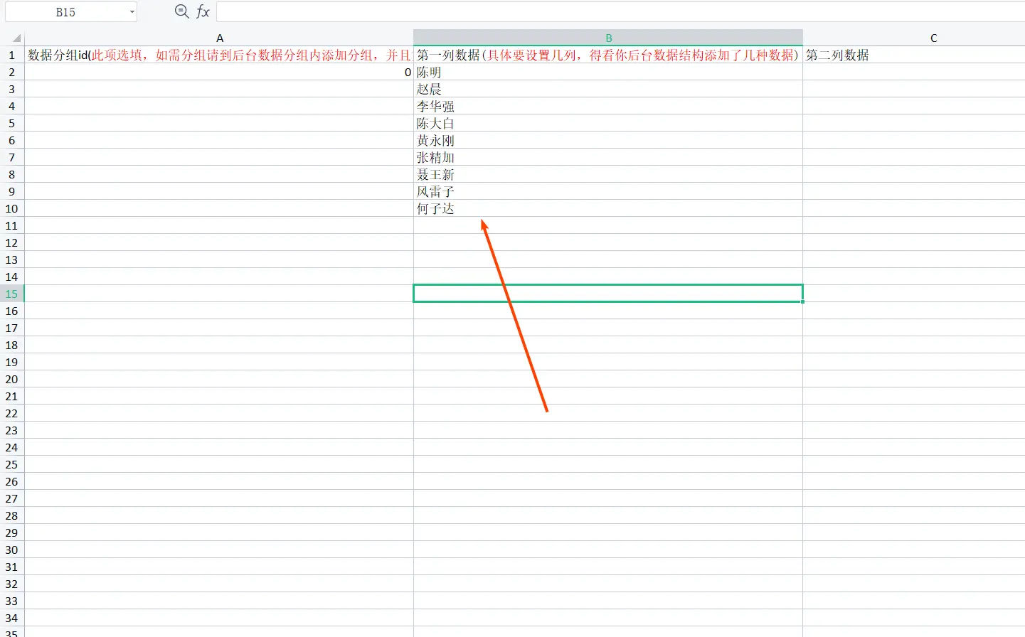 表格修改说明:修改下载好的表格B2这一列数据, 就是张三 这一列即可,其他不要删除,然后保存后上传导入