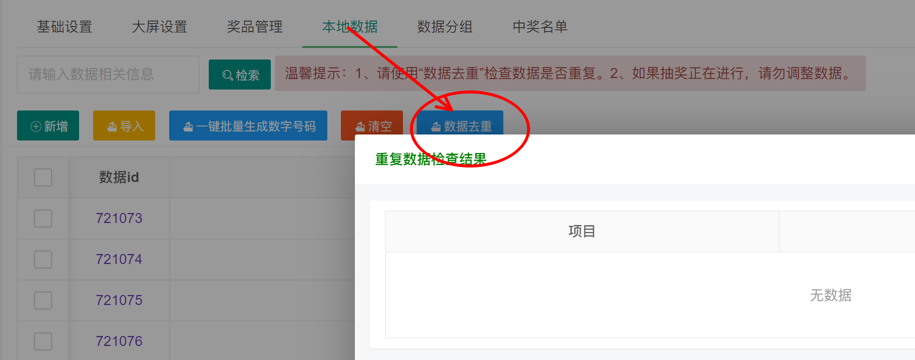 如果导入的数据有重复也可以使用去重检测功能 如下图,导入名单后 查看数据,根据提示删除,或者重新整理表格导入。
