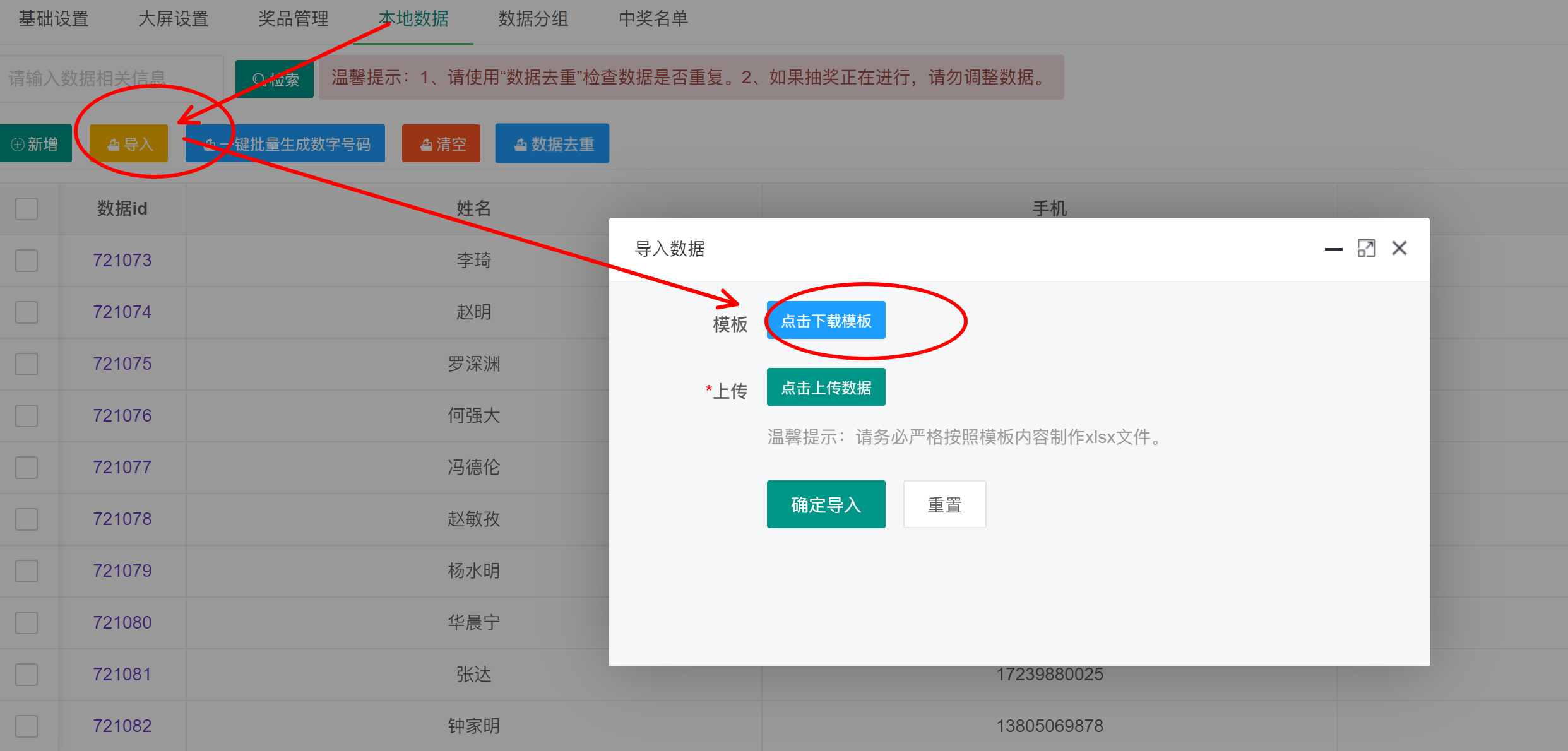 按图示箭头指向找到本地数据-导入- 弹出点击下载模板。