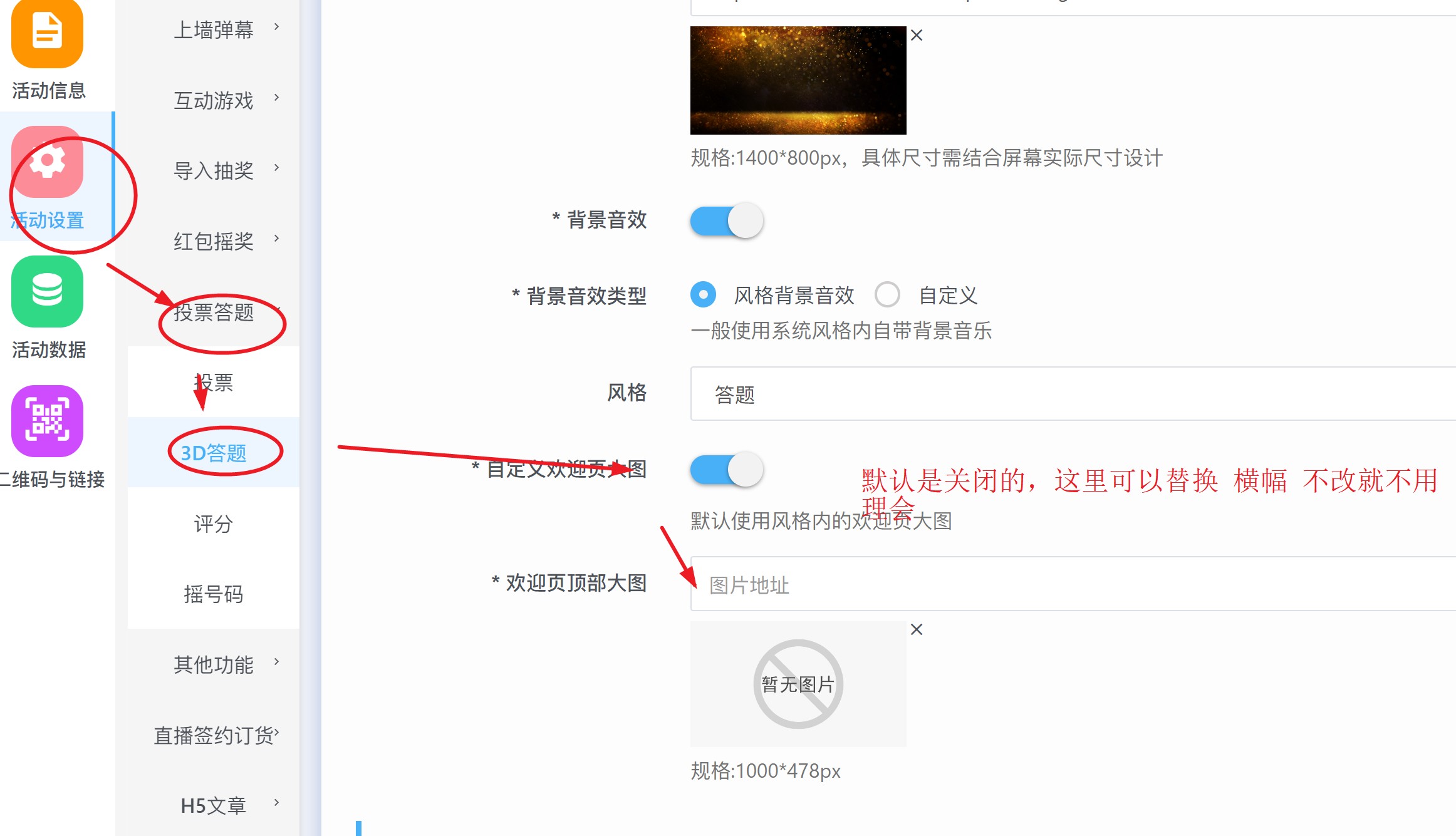 进入答题,可以对基础设置一下背景图 和中间的欢迎横幅,这个如果不改就忽略,看下一步