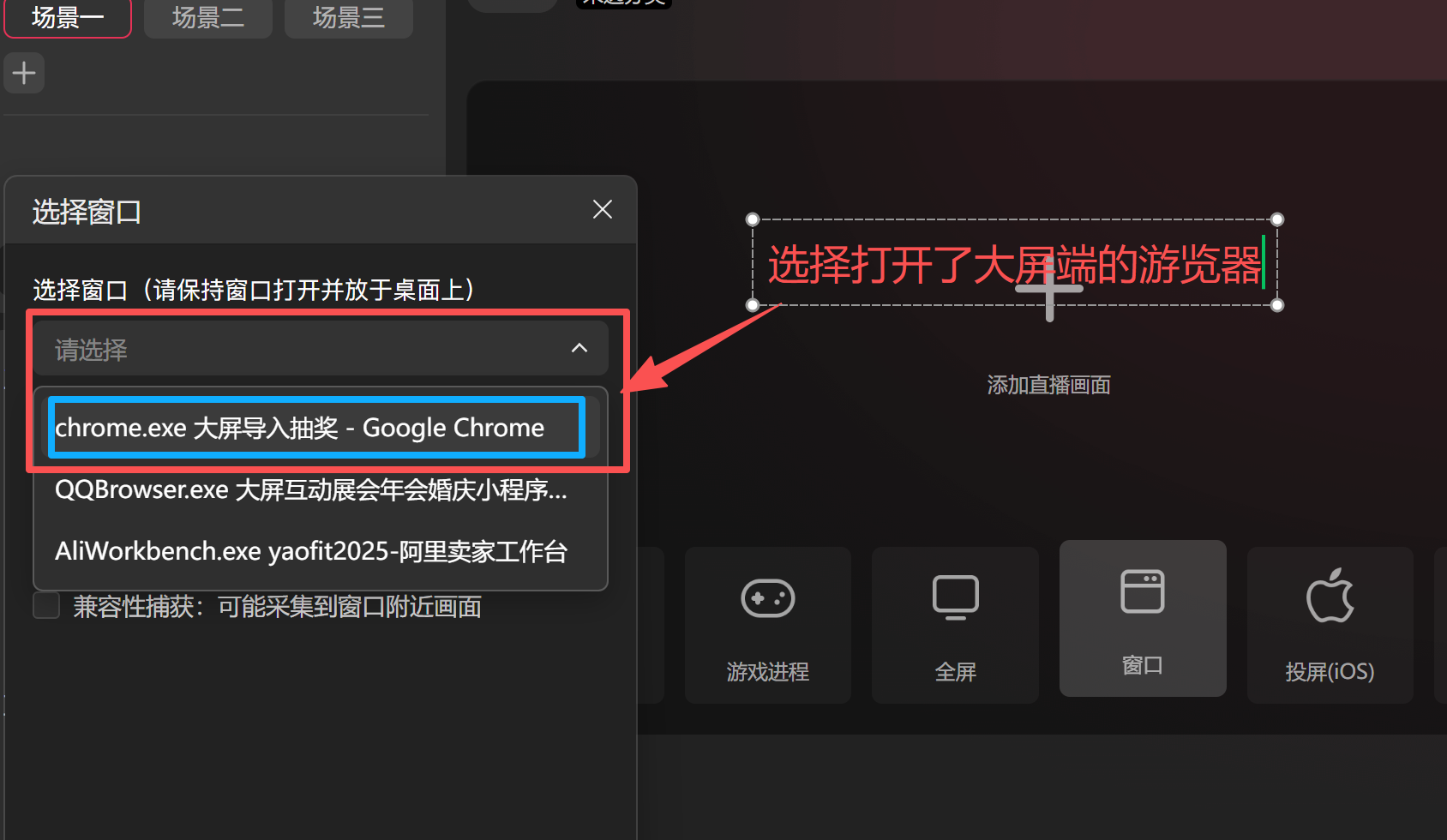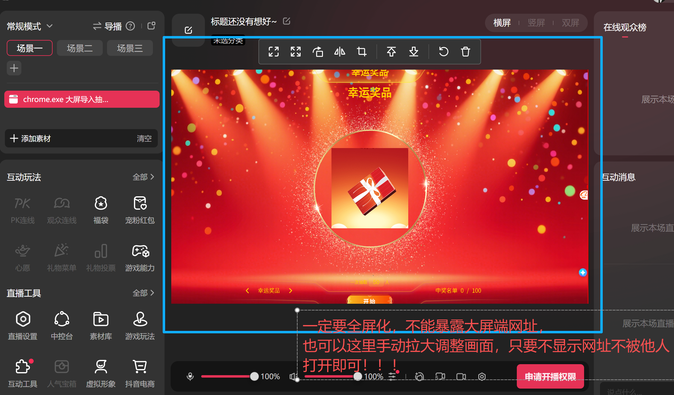 (强烈建议电脑使用分屏,就是2个屏幕,一个用来控制直播软件,一个用来打开大屏端网址,抽奖的时候鼠标移动到大屏端网址控制):